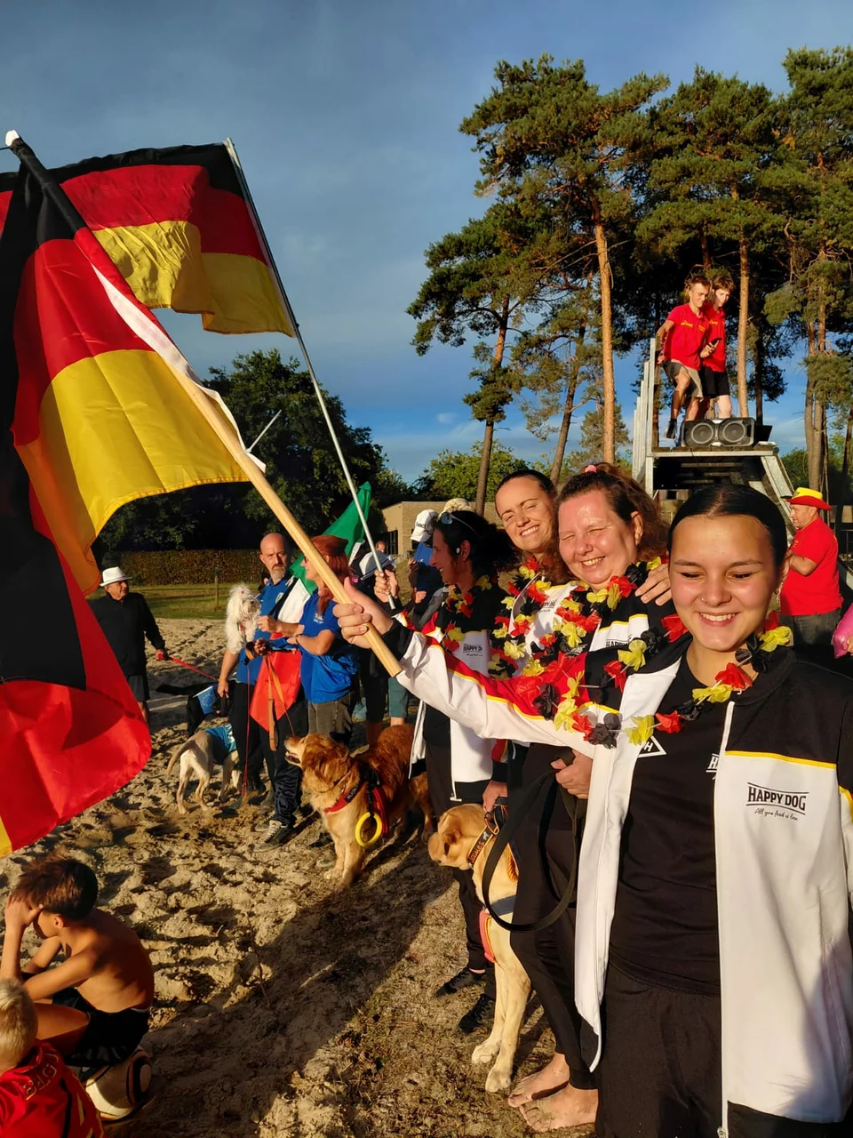 Ein besonderes Highlight war die herzliche Unterstützung der Neufundländer Wasserarbeitsgruppe Westerwald um Kerstin und Walter Wehler. Die Westerwälder haben das deutsche Team regelrecht adoptiert und mit ihrem tollen Fanclub eine warme, einladende Wagenburg geschaffen. Abends saßen wir gemeinsam, gut versorgt und mit einem wachsamen Auge auf Hunde und Lager – ein Zusammenhalt, der uns tief berührt hat. Danke für eure jahrzehntelange Treue und Wärme, die unseren Sport so besonders macht!