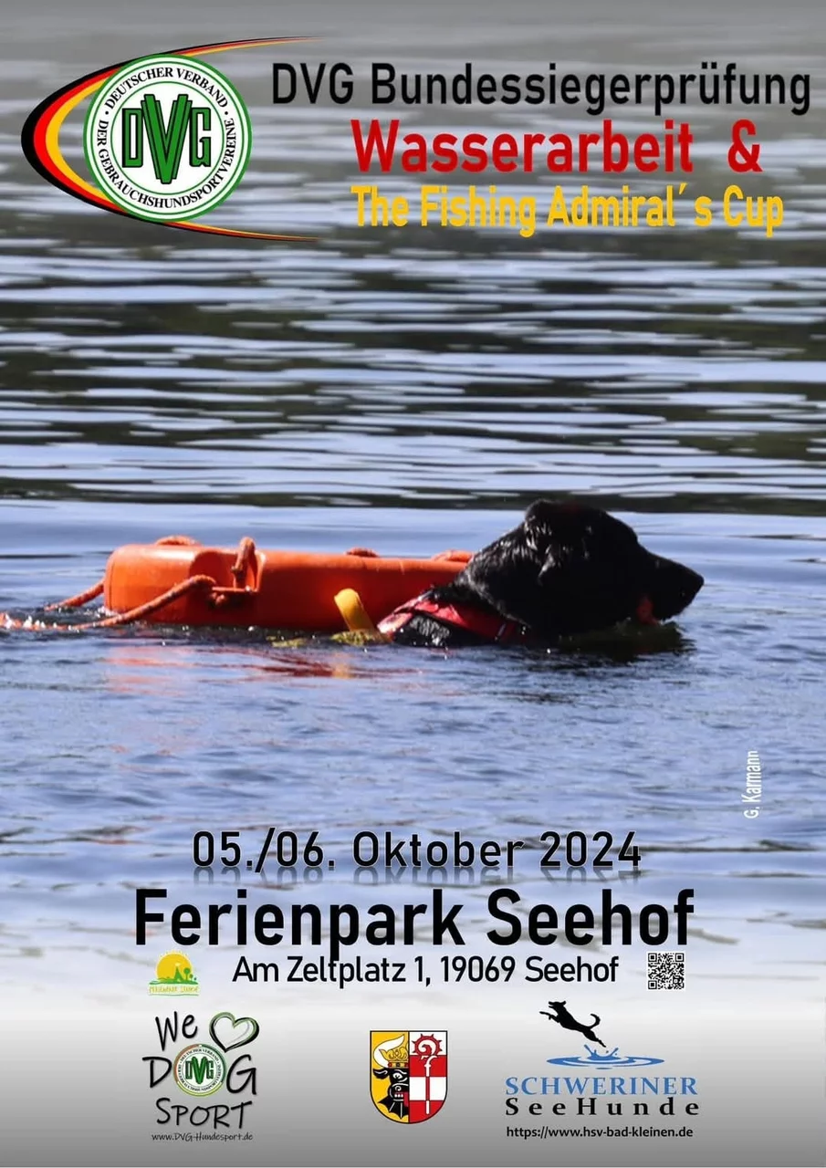 Am 05. und 06. Oktober 2024 fand erstmalig die DVG-Bundessiegerprüfung Wasserarbeit & der Fishing Admirals Cup auf dem Campingplatz Seehof am Schweriner See statt. Ausrichter war der HSV Bad Kleinen und deren Wasserarbeitssparte die Schweriner Seehunde, unter der Prufungsleitung von Wolfgang Pahl. Etwa 35 Mensch-Hund-Teams aus Deutschland, Belgien, den Niederlanden, Dänemark, Estland und Schweden traten in insgesamt 9 Diplomen gegeneinander an.